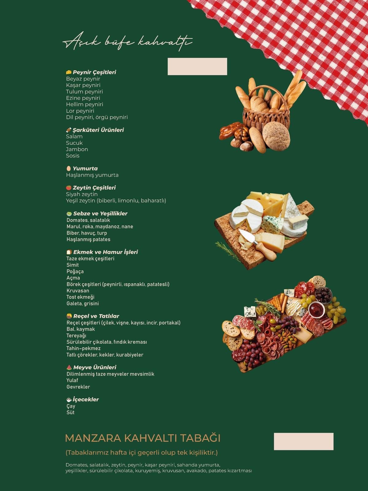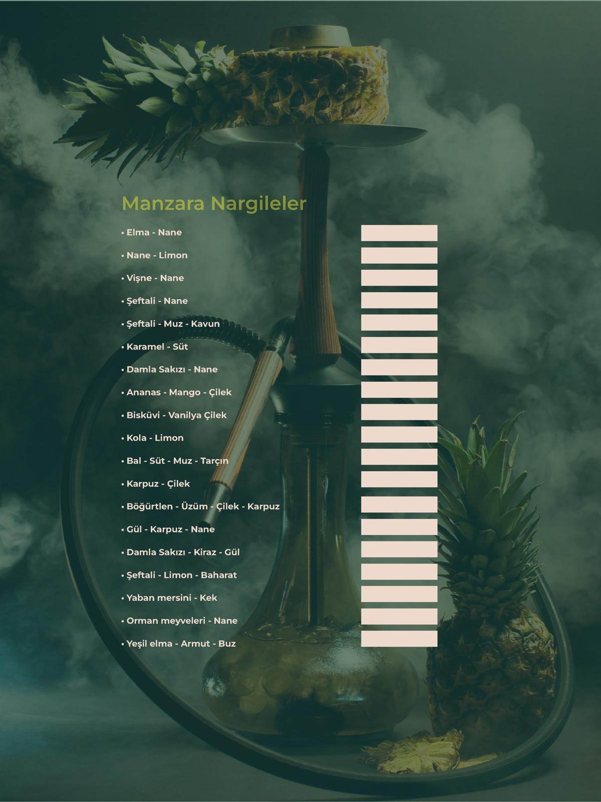 Antalya’da manzaralı kafe ve bistro deneyimini tamamlayan menümüz; kahvaltıdan kahveye, tatlıdan nargileye uzanan zengin seçenekleriyle uzun oturumlar, paylaşım ve keyifli anlar için özenle hazırlandı. The Manzara’da menü, seçim yapmak değil, zamanı yaşamaktır.